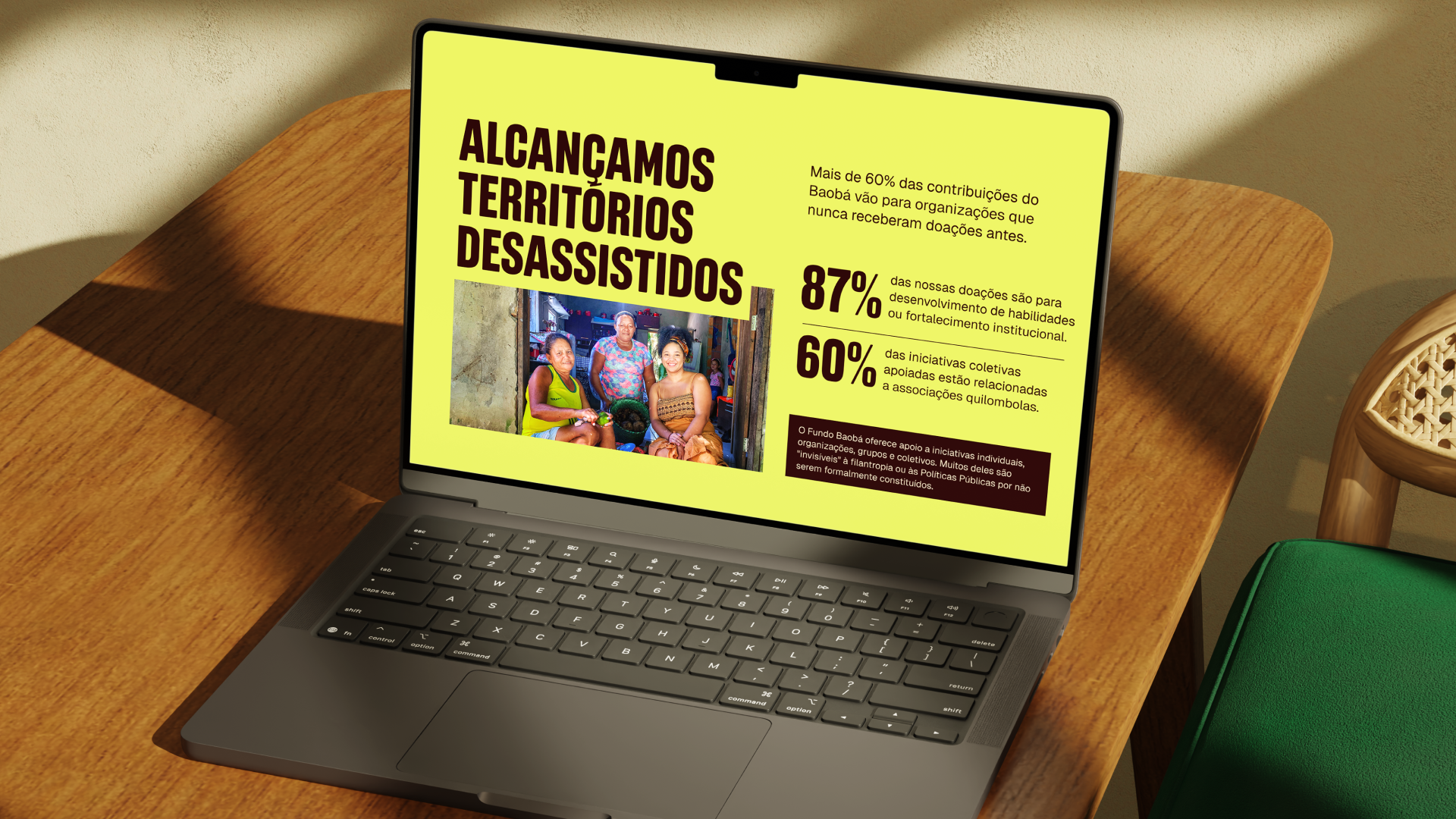 Traduzir a grandeza e a relevância do Fundo Baobá no contexto brasileiro, tornando a marca mais atrativa para diferentes públicos, especialmente jovens negros e negras, e ampliando seu engajamento com chamadas e editais. Além disso, fortalecer a cultura interna da organização, garantindo que ela represente com autenticidade quem faz parte do Fundo.
