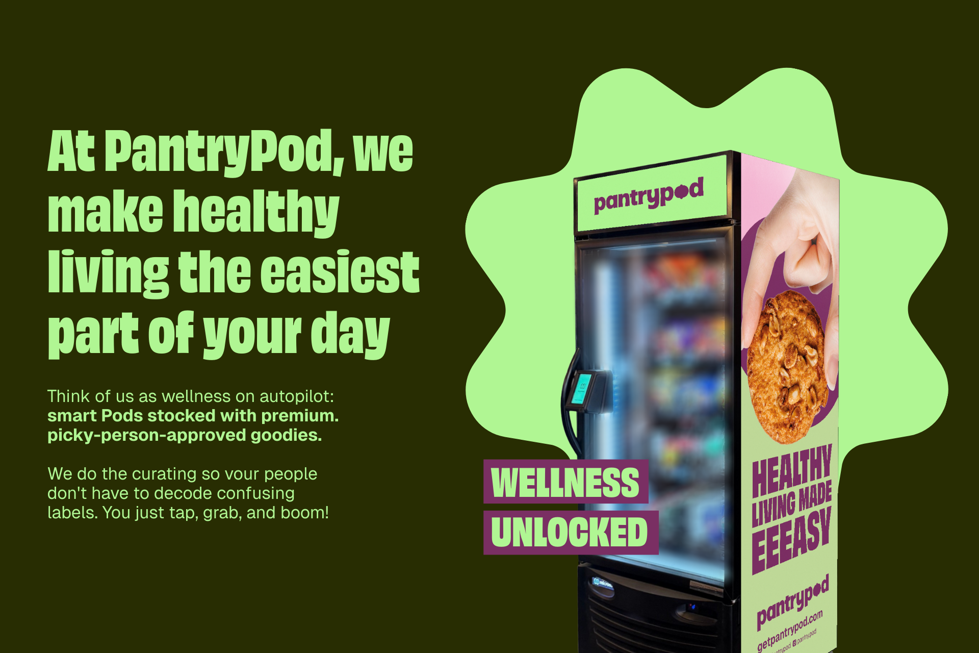 A PantryPod surgiu da ideia de alcançar um espaço ainda não ocupado no mercado de conveniência grab and go. O mercado de vending machines sempre foi muito associado ao lifestyle de pessoas que não se importam com a saúde e o estigma de que não se encontra produtos saudáveis e de alta qualidade dentro dessas máquinas.